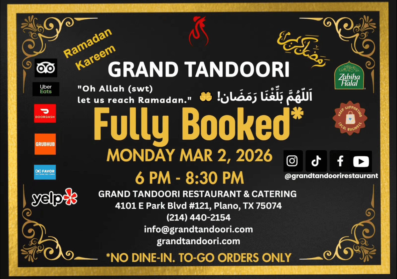 Iftari (breaking of Fast) during Ramadan 1447 AH is by reservation only and we have the whole restaurant reserved on a number of days during the blessed month of Ramadan. You can still place To-Go orders, Pre-ordered Ramadan Iftari boxes, Catering orders for menu items especially Samosa, Jalebi, Pakora, Spring Rolls, Patties, Shami and Chapli Kababs etc. No Dine-in until after Iftari rush hour. Apologies in advance! 🤲🙏