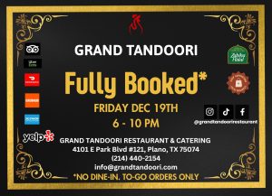 Please note that Grand Tandoori Restaurant & Catering will observe closure on Fridays from 1:30 PM to 2:30 PM to allow staff to attend the Friday congregation prayer (Jummah Salah). We will not be accepting Dine-in or To-Go orders during this one hour window. Business will resume as usual outside this one hour break. Thank you for your understanding in allowing flexibility for restaurant staff to practice their religious rights.